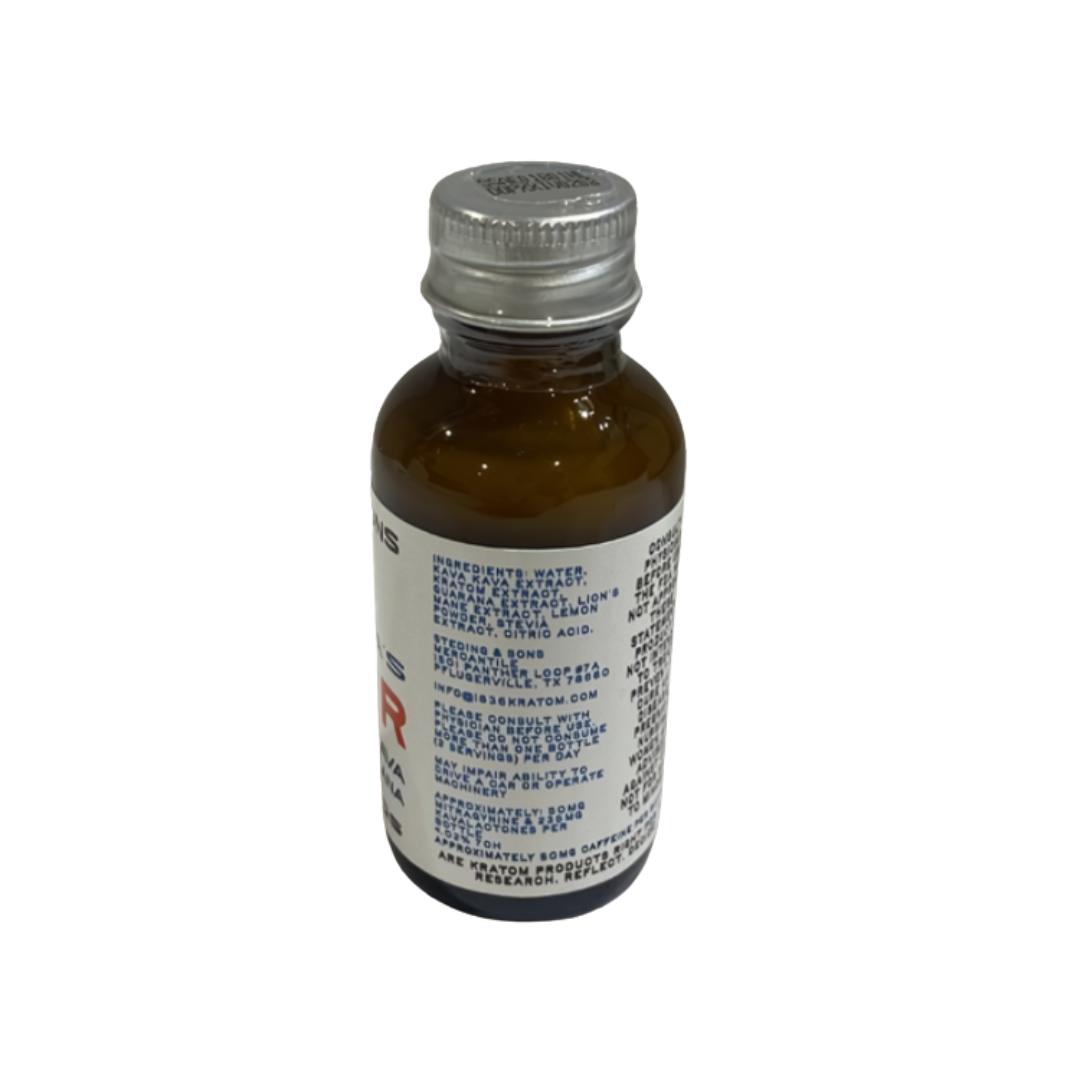 Ingredients:Â Water, Kava Kava Extract, Kratom Extract, Guarana Extract, Lion’s Mane Extract, Lemon Powder, Stevia Extract, Citric Acid