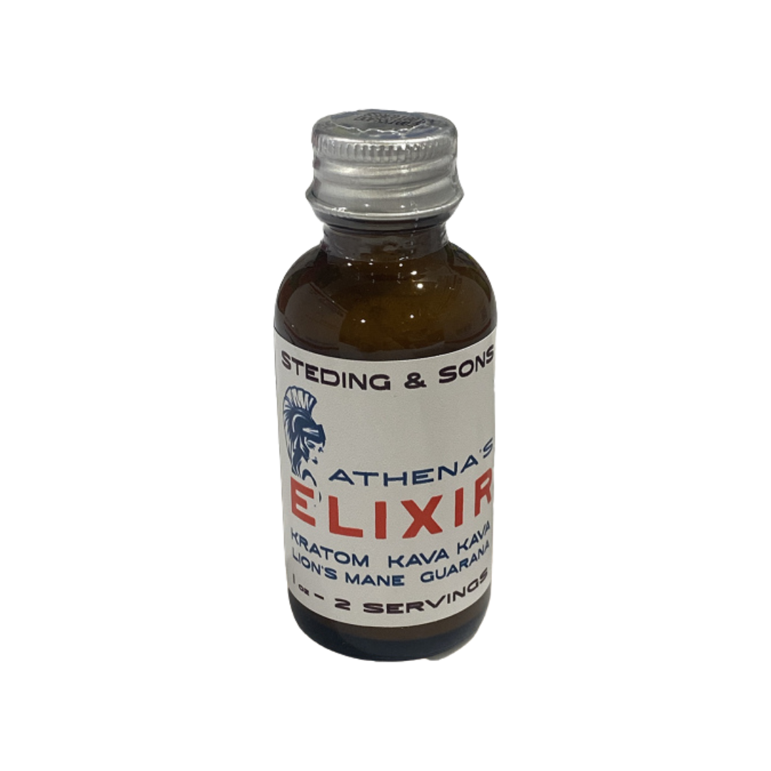 1836 Kratom Athena’s Elixir Kratom + Kava Extract Shots come in a 30ml glass bottle. Each bottle contains two 15ml servings of approximately 50mg of mitragynine, 300mg of kavalactones, and 55mg of caffeine from a proprietary Lion’s Mane and Guarana blend.