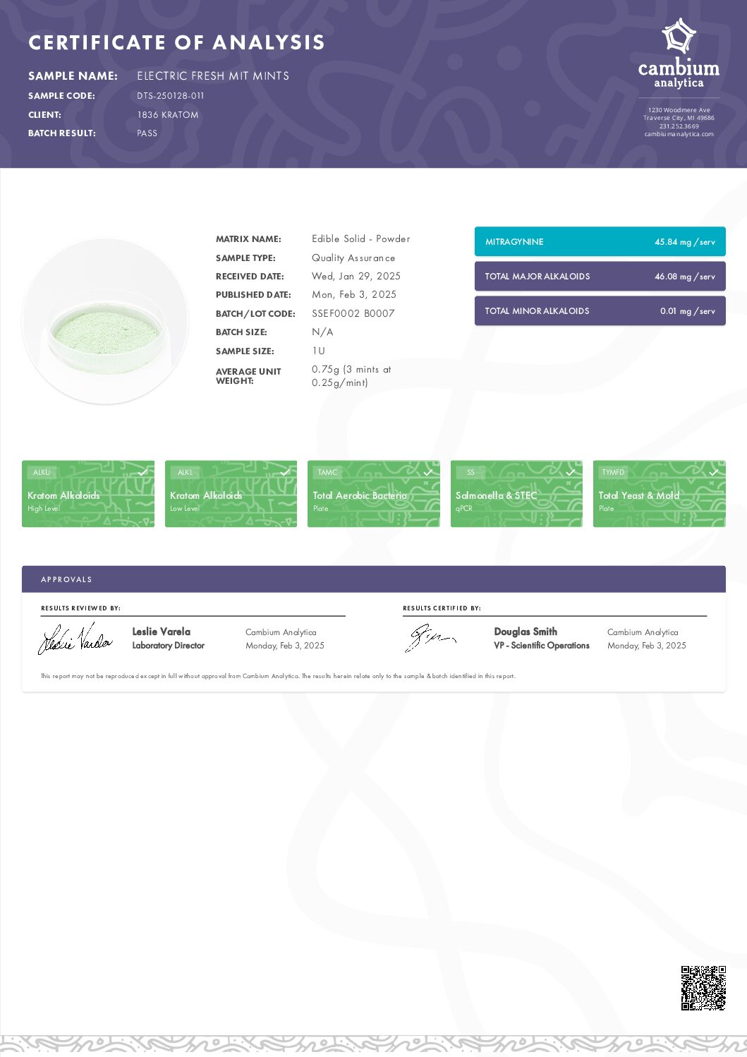 Electric Fresh Mit Mints pack a powerful punch! Each tiny mint is comparable to 1g of kratom, so you can moderate as you choose. Perfecct for convenient anytime energizing refreshment.