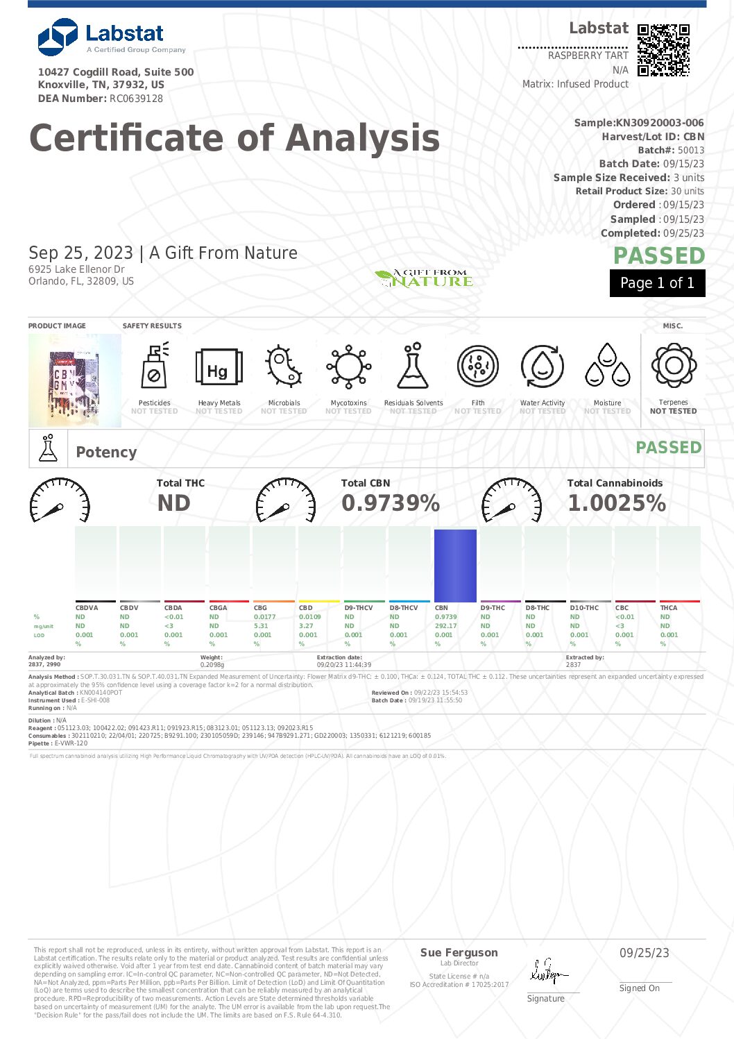 A Gift From Nature goes to great depths to source the highest quality natural ingredients for formulation. They are a seed-to-shelve company making sure all hemp maintains in quality from start to finish. All hemp extracts are sourced from extractors using American grown hemp. Every batch of extracts are vigorously third party tested for potency, terpenes, pesticides, bacteria, as well as residual solvents. A Gift From Nature believes in offering only the highest quality and cleanest products to our customers, so we solely rely on CO2 extraction, for its non-toxic characteristics.