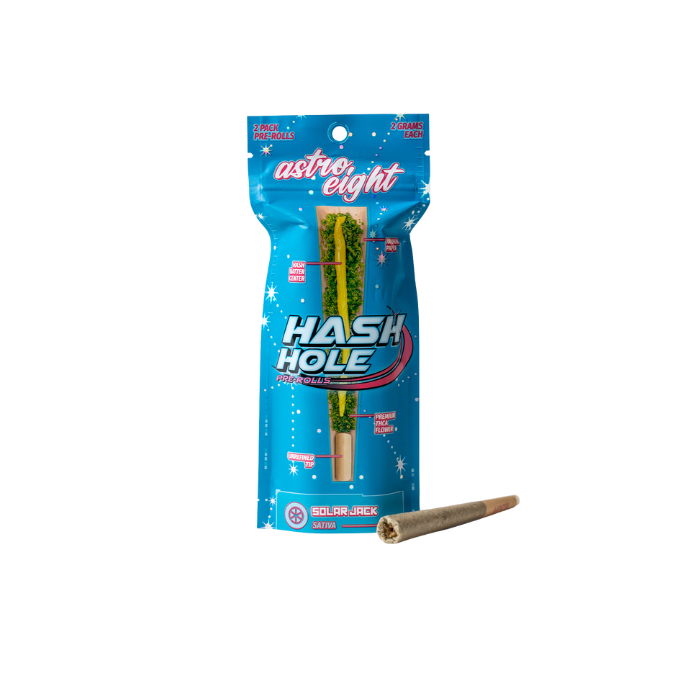Experience the next level of potency with Astro Eight Hash Hole Pre-Rolls. Solar Jack (Sativa): A vibrant strain with an earthy, citrus aroma, perfect for daytime use. Each pre-roll contains 2 grams of premium THC-A flower and a core of potent hash batter, delivering an intense, sensory-elevating effect. With a total of 4 grams in every pack, these pre-rolls are designed for seasoned users looking for a powerful, well-balanced experience.