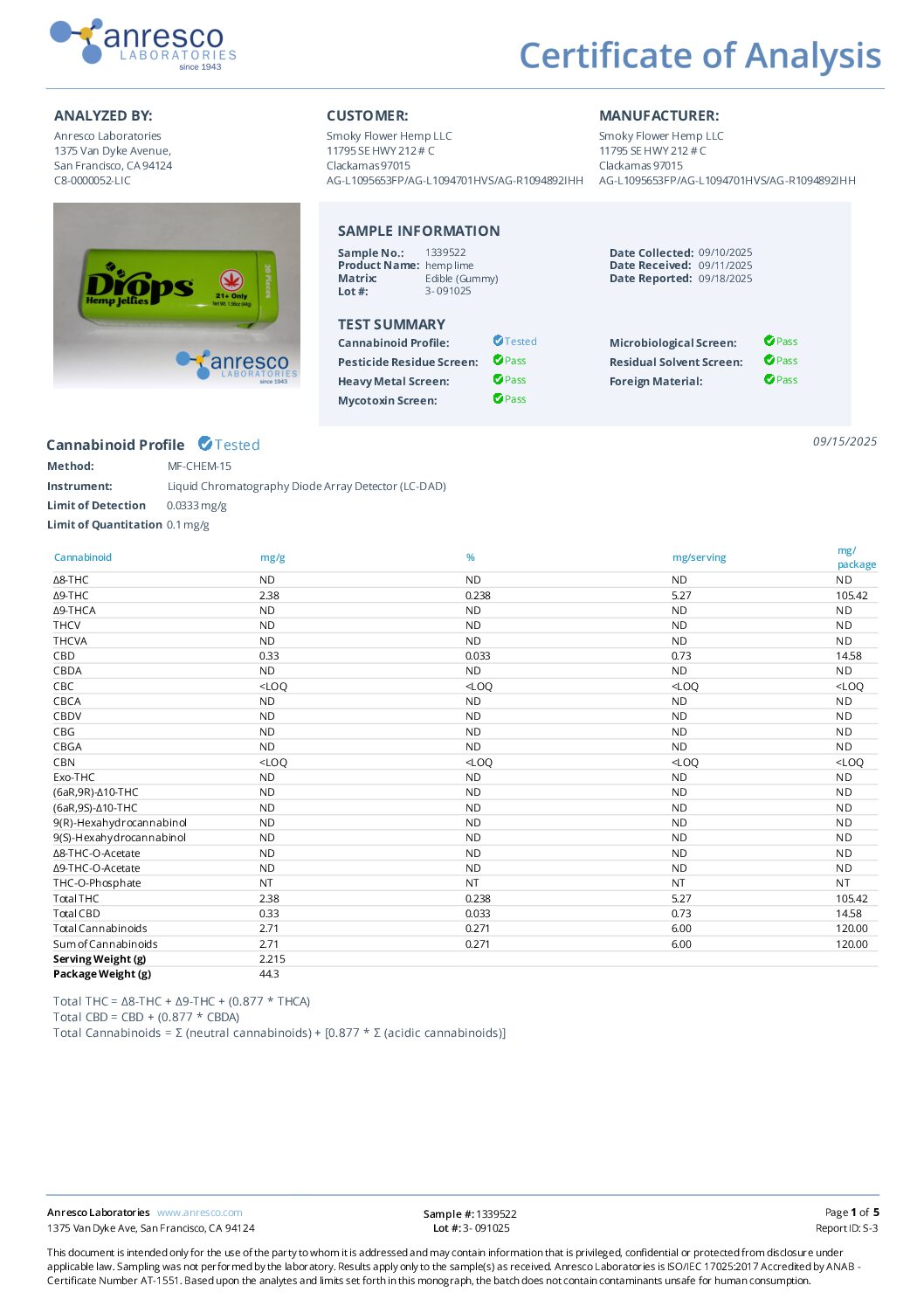Ingredients: Sugar, Corn Syrup. Water, Pectin, Natural Essential Oil, Citric Acid, Hemp Concentrate (rosin), Hemp Extract, Natural Coloring