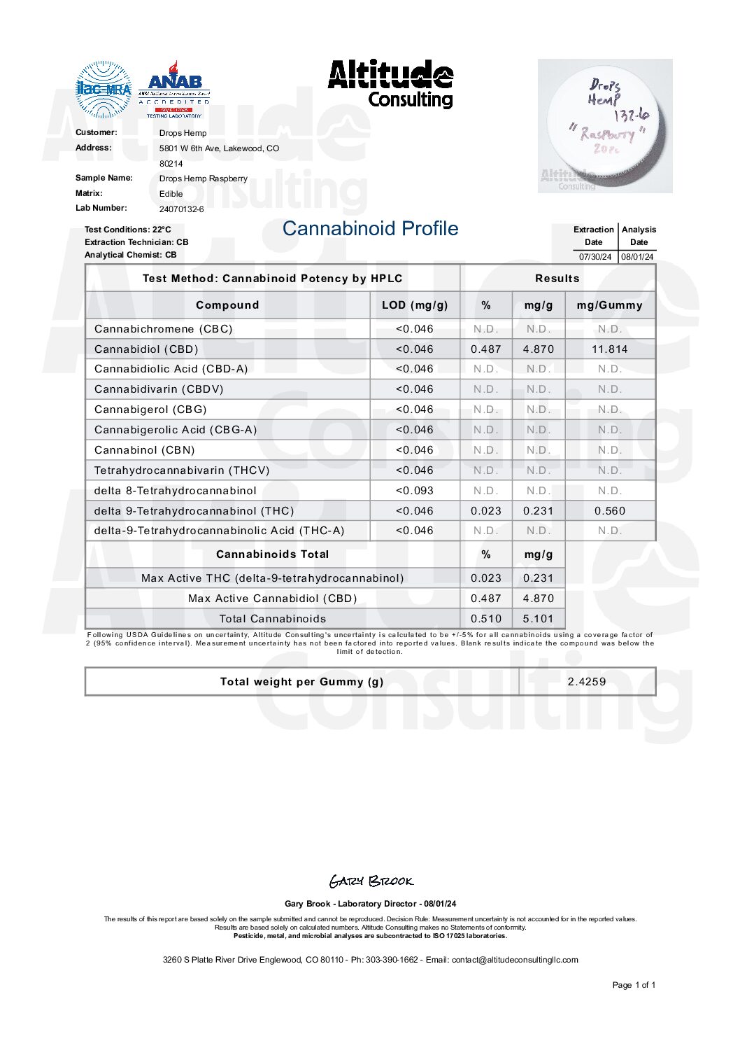 Drops Hemp Live Rosin Jellies Raspberry is a warm and bubbly Sativa. The Oregon Sweetgum strain has hints of delicious raspberry along with potent cannabis derived terpenes such as, myrcene, terpinolene, and cedrol. This blend is perfect for those who want a nice and rosy feeling added to their daily routine!