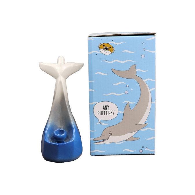Attached to the head of the dolphin is a pipe where you can pack your herb and light it. The smoke filters up the body to the mouthpiece on the tail, allowing you to enjoy a smoke with a difference. The pipe comes packaged in a gift box. This product is recommended for adult use only.