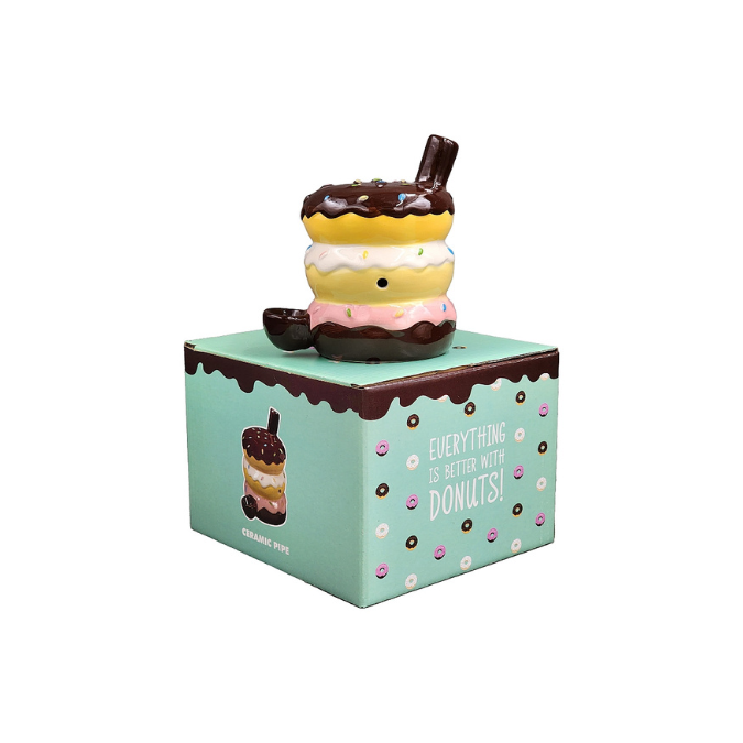 This fun novelty adult pipe is made of ceramic. It features a triple stack of donuts smothered in vanilla, chocolate and strawberry icing and topped with rainbow sprinkles. A decadent chocolate stick is the pipe.