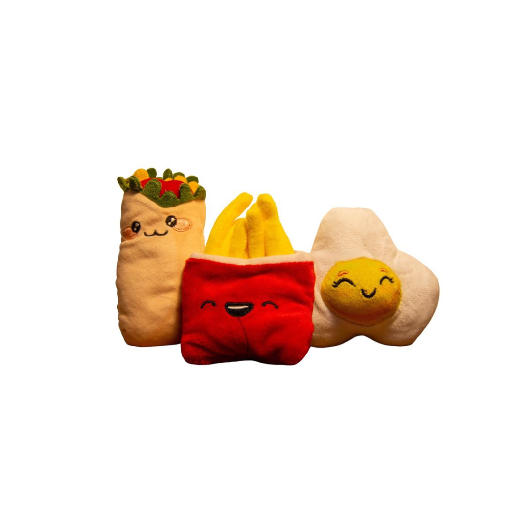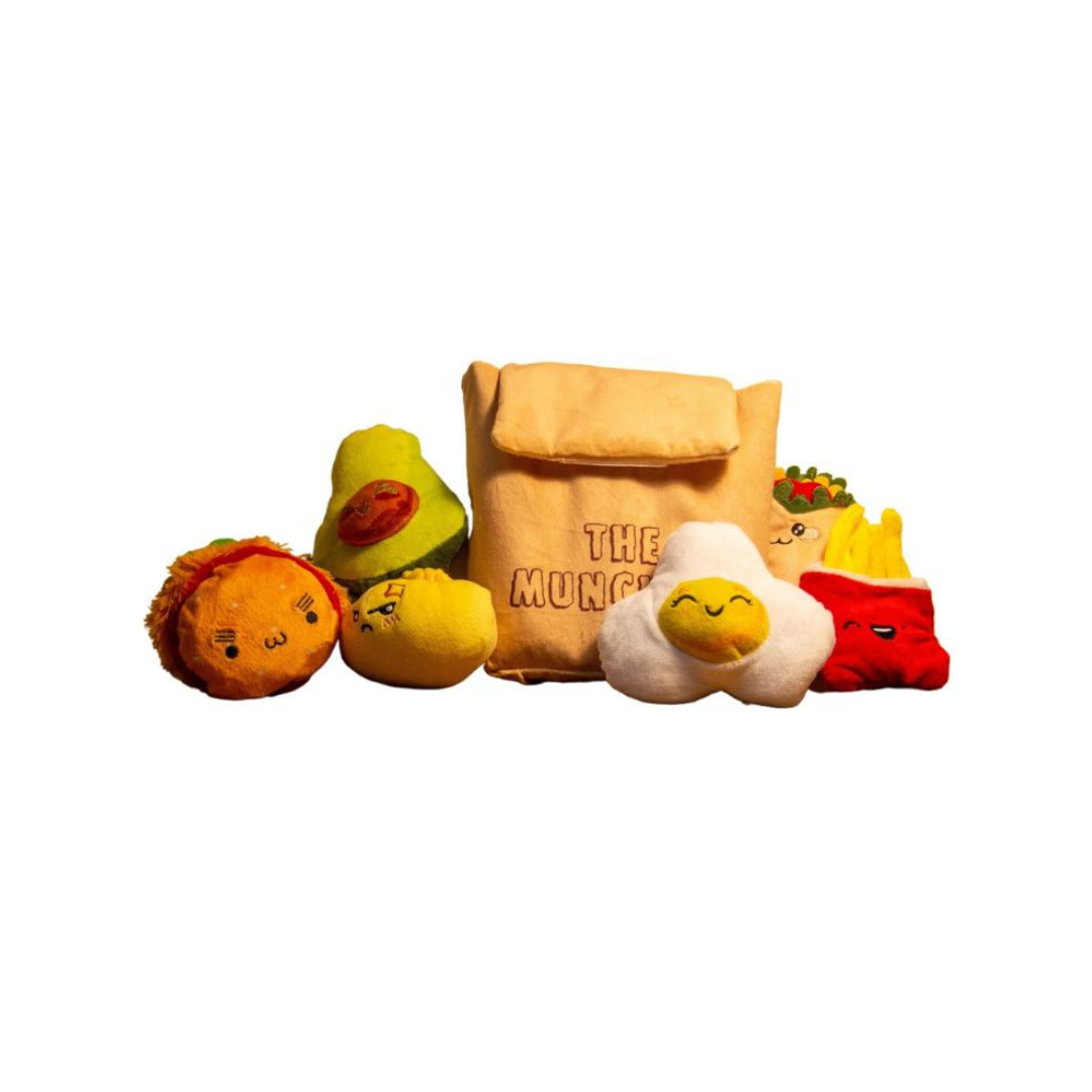 The Munchies bag comes with 6 cute and expressive food toys with an opening to hide a treat in the back plus a crinkly bag.