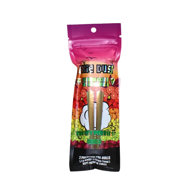 The Pixie Dust THCA 3g Pre Rolls Indica – Fruity Pebbles come in a 2-count pack, with each smooth pre roll at 1.5g. Infused with the sweet, nostalgic flavor of Fruity Pebbles, these Indica rolls deliver a relaxing, full-bodied experience perfect for winding down. Crafted for convenience and quality, they’re ready to spark up whenever you are.