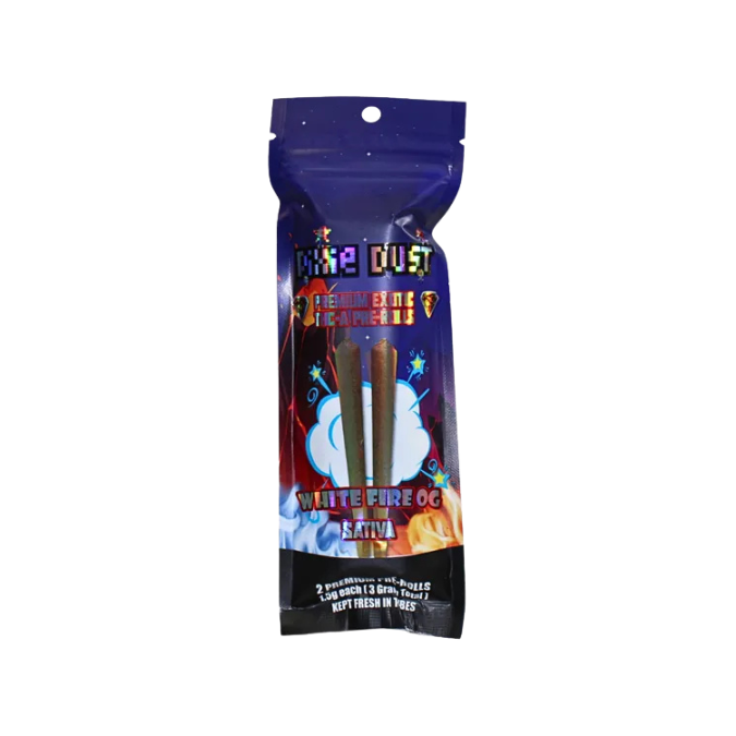 The Pixie Dust THCA 3g Pre Rolls Sativa – White Fire OG pack includes 2 pre rolls at 1.5g each, offering a total of 3g of premium flower. Bursting with the pungent, earthy-citrus notes White Fire OG is known for, these Sativa pre rolls deliver an uplifting, energizing experience. Perfect for sparking creativity or powering through the day, they’re rolled and ready for any occasion.