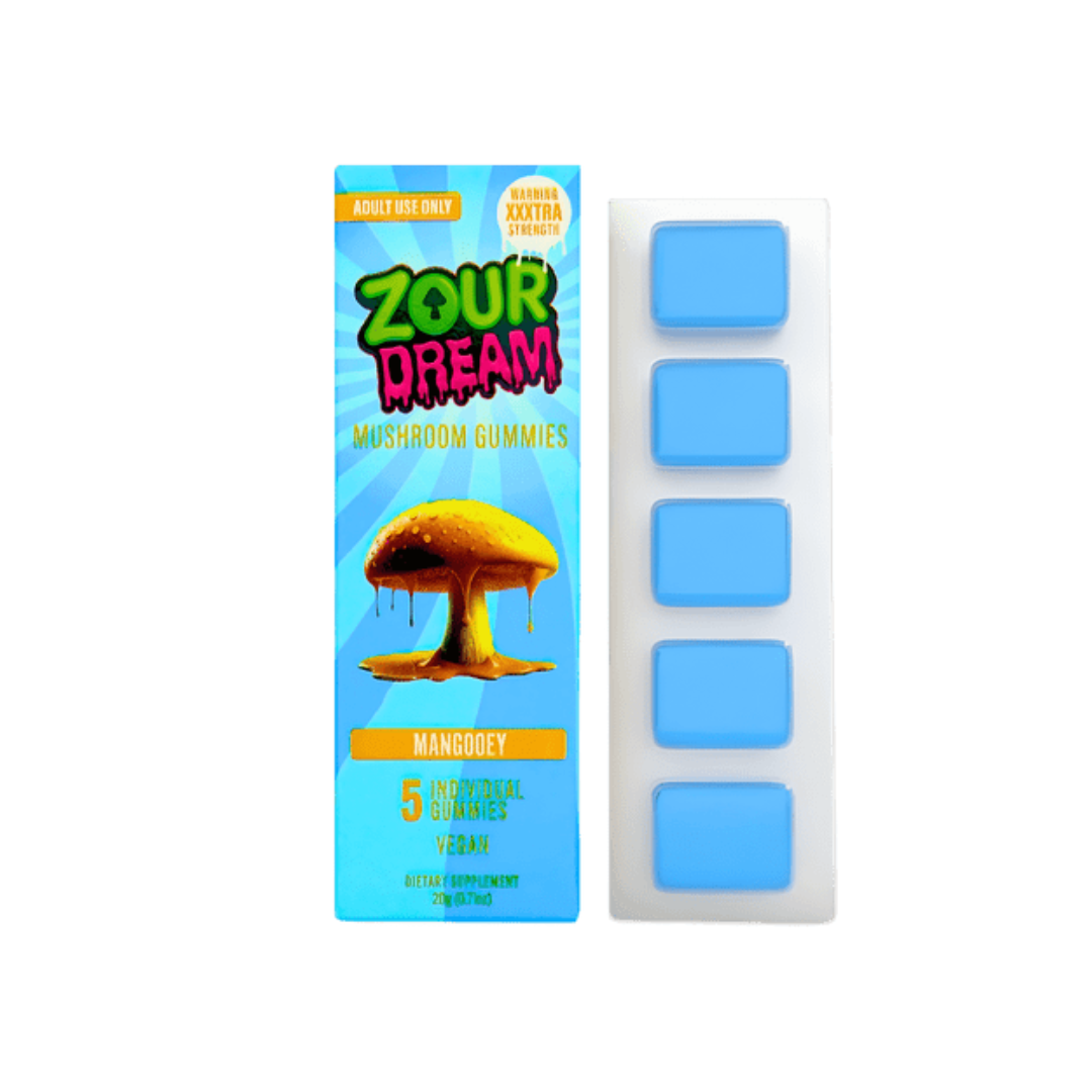 - Mangoey – Bright and zesty. It packs a sharp bite that quickly softens into a crisp, juicy sweetness perfect for sparking energy and curiosity.Zour Dream’s Mangoey Mushroom Gummies come with 5 gummies per pack, with each filled with an extra strength blend of botanicals and nootropics, creating a high that’s potent, euphoric, and other-worldly.